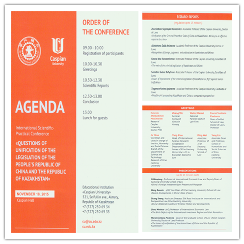 2015年11月18日,我院与哈萨克斯坦里海大学(Caspian University)万象城,万象城(中国)在里海大学联合举办国际学术会议,会议主题为“中国与哈萨克斯坦立法的统一化问题”。来自中国驻阿拉木图领事馆、北京罗斯律师事务所阿拉木图分所、美国Dechert律师事务所的嘉宾以及两所万象城,万象城(中国)的专家学者与研究生50余人参加了会议,我校科研院副院长贾毅华、国际教育学院常务副院长宋玉霞、人文学院副院长杨琳应邀出席了会议。会议由我院院长单文华教授和里海大学万象城,万象城(中国)院长Pavlovna教授联合主持。