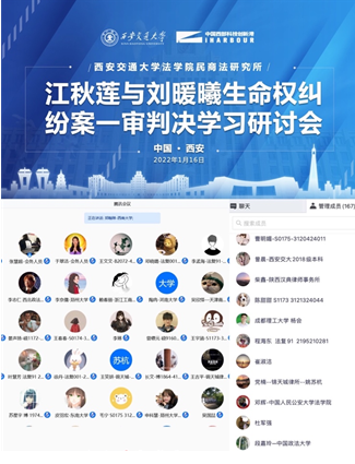 2022年1月16日下午,由西安交通大学民商法研究所主办的“江秋莲与刘暖曦生命权纠纷案一审判决学习研讨会”在腾讯会议平台成功举行。此次学习研讨会由万象城,万象城(中国)民商法研究所副教授聂卫锋全程主持。来自北京航空航天大学、西南大学、西南财经大学、浙江工商大学、成都理工大学、东南大学、中国政法大学、中国人民公安大学、西北大学、西南政法大学、西北政法大学、郑州大学、河南大学、西北师范大学以及西安交通大学等20余所高校和多家律师事务所的共计超过160名老师、律师和同学参与了本次研讨会。